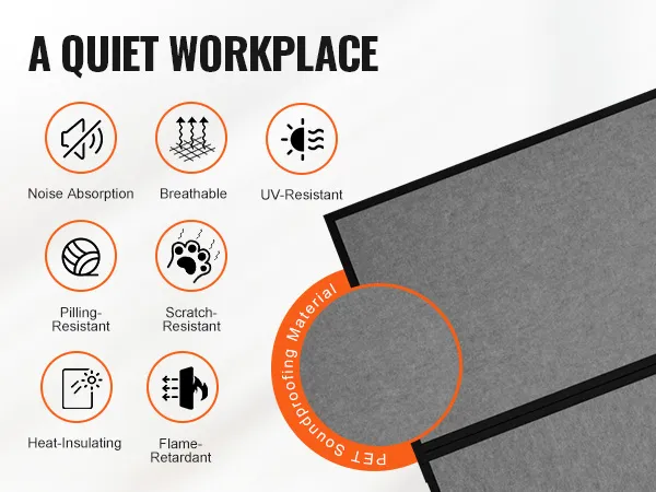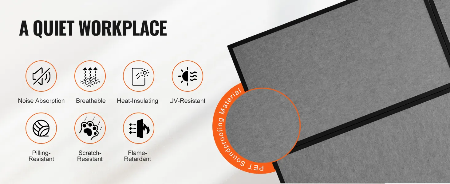 PET Soundproofing Material: Our screen fabric has been upgraded to PET soundproofing material, which absorbs 85% of ambient noise. Paired with soft padding, it significantly enhances privacy, thermal insulation, breathability, and light blocking, creating a quiet working environment. As an office partition, it also serves as an ideal background for online meetings, making it a perfect choice for work, relaxation, and enjoying a peaceful environment.