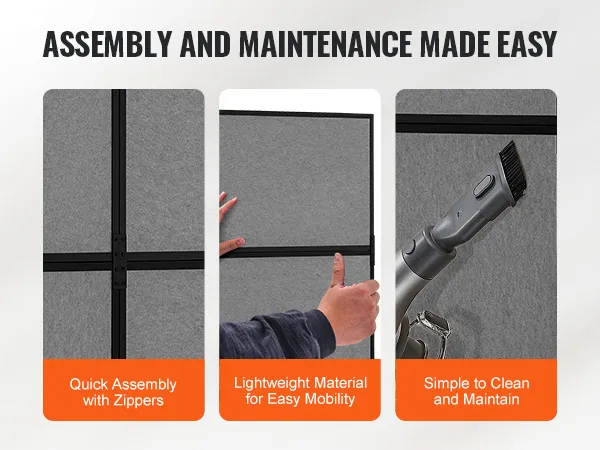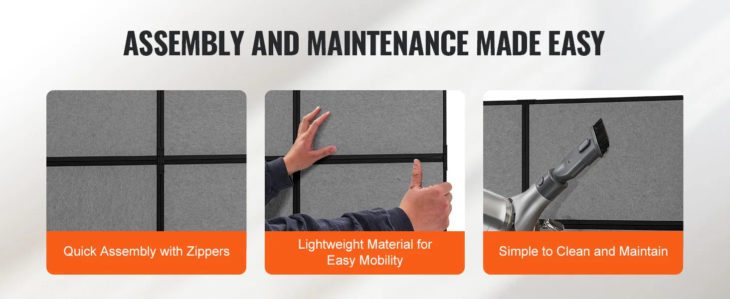 Easy Assembly & Mobility: With all necessary accessories and a detailed installation manual included, the screen is easy to assemble without the need for drilling. Simply connect the panels with the zippers and insert the metal pipe fittings into the bottom holes of the dividers. Assembly takes about 15 minutes, and we recommend two people for a quicker setup. The office partition panel design makes it easy to move and reposition, offering flexibility for any office setup.