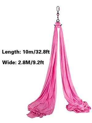 10m/33ft x 2.8m/9ft aerial silk made of 100% polyester is smooth, slick, easy-to-grip. Suitable for beginners learning to climb and the experienced to practice.