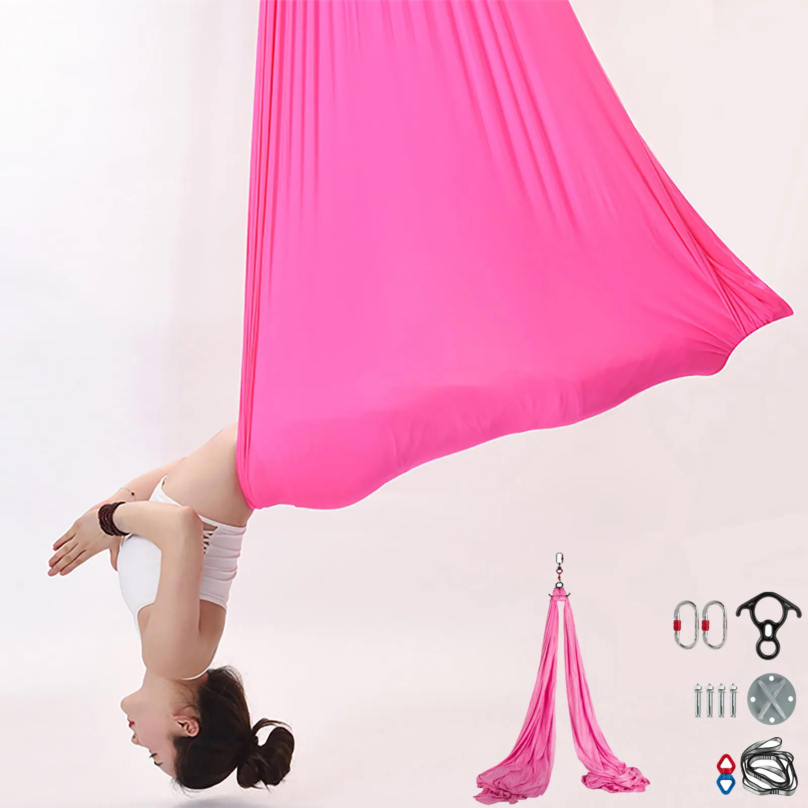 Here we offer you this beautiful aerial silk set. It has everything you need for aerial dance or aerial yoga at the home, studio, or outside. Come and get one right now!
