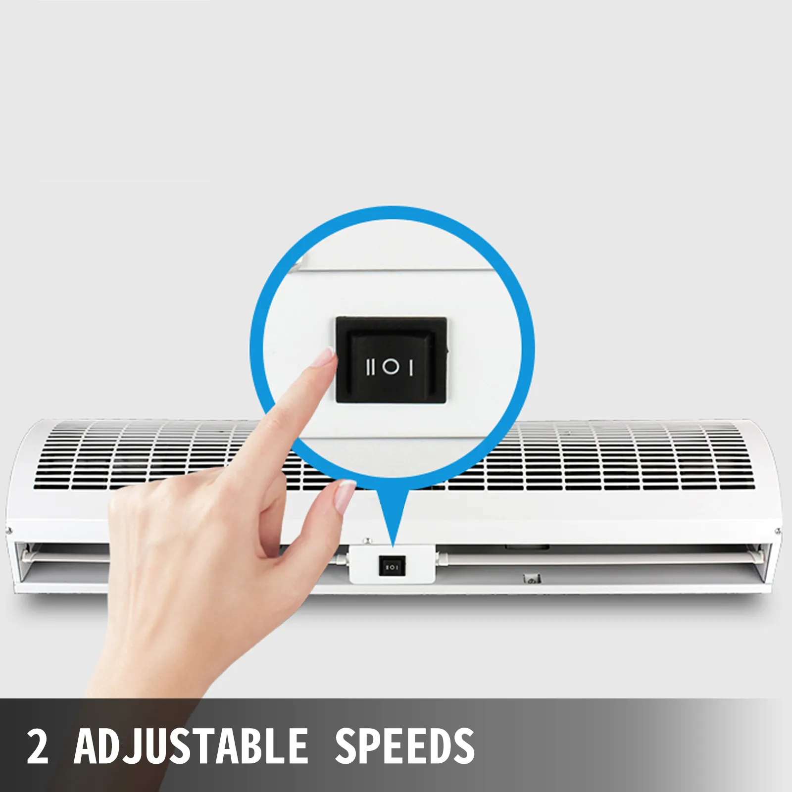 The air curtains for doors are equipped with a button (low/off/high) to change the speed of the wind. With a high speed of 1322.3 CFM, and a low speed of 1082.0 CFM.