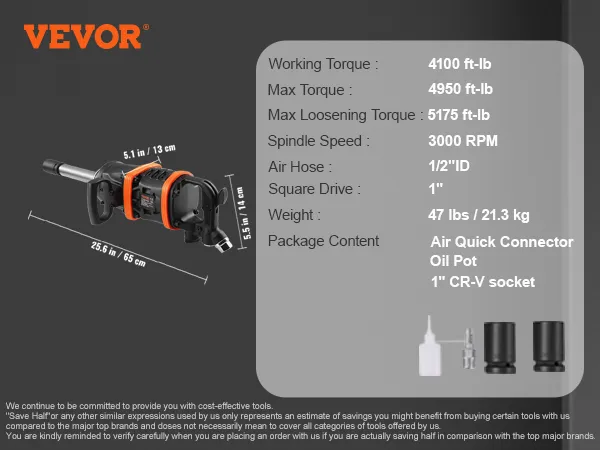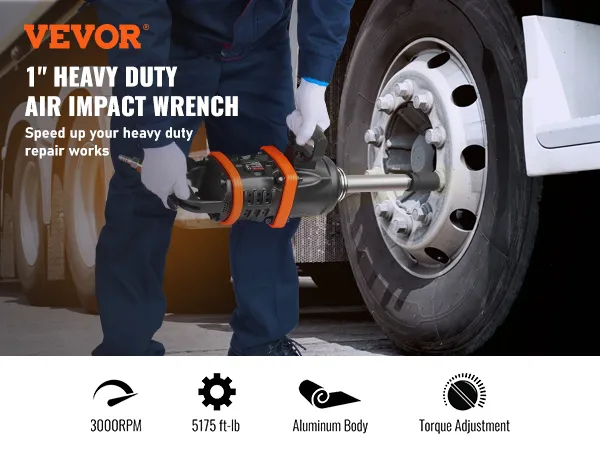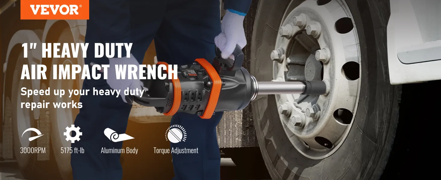 VEVOR 1 Inch Air Impact Wrench, Up to 5175 ft-lbs Beast Reverse Torque Output Pneumatic Impact Gun w/ 8 Inch Extended Anvil for Repairs and Maintenance of Heavy Duty Machinery / Semi-Truck / Bus