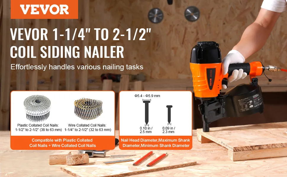 Outstanding Performance: VEVOR CN65 pneumatic coil nailer is compatible with both wire-collated coil nails (32mm - 63mm) and plastic-collated coil nails (38mm - 63mm), with head diameters ranging from Φ5.5 to Φ5.9 mm. It is ideal for assembling pallets, wooden boxes, fencing, and general construction tasks such as siding, decking, and sheathing. (Compatible Shank Diameter: Min 2.3 mm - Max 2.5 mm)