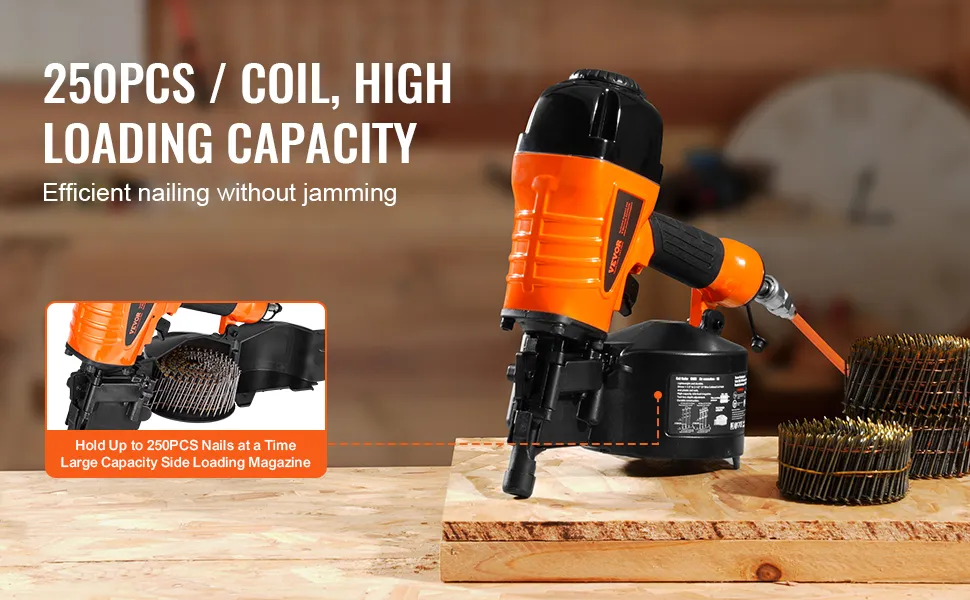 High Loading Capacity: Our 15-degree coil siding nailer features a large-capacity side-loading magazine that can hold up to 250 nails at a time, ensuring efficient work without frequent reloading. The high-strength magazine offers long-lasting durability and reliability.