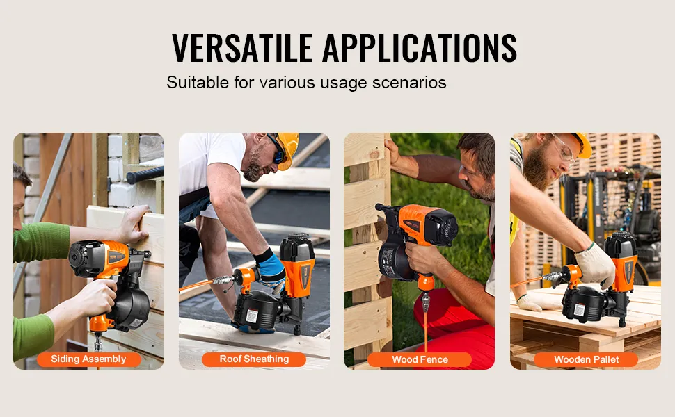 VEVOR CN65 pneumatic coil nailer is compatible with wire-collated coil nails (32mm - 63mm) and plastic-collated coil nails (38mm - 63mm). Suited for home improvement and repair tasks, it excels in assembling wooden packaging boxes, wooden pallets, wooden furniture, fences, and more.
