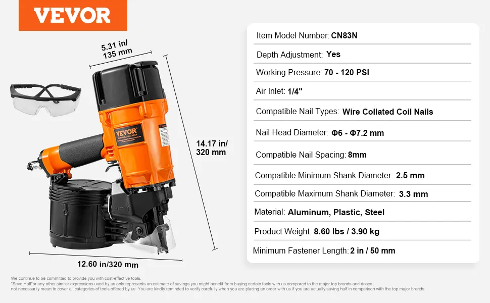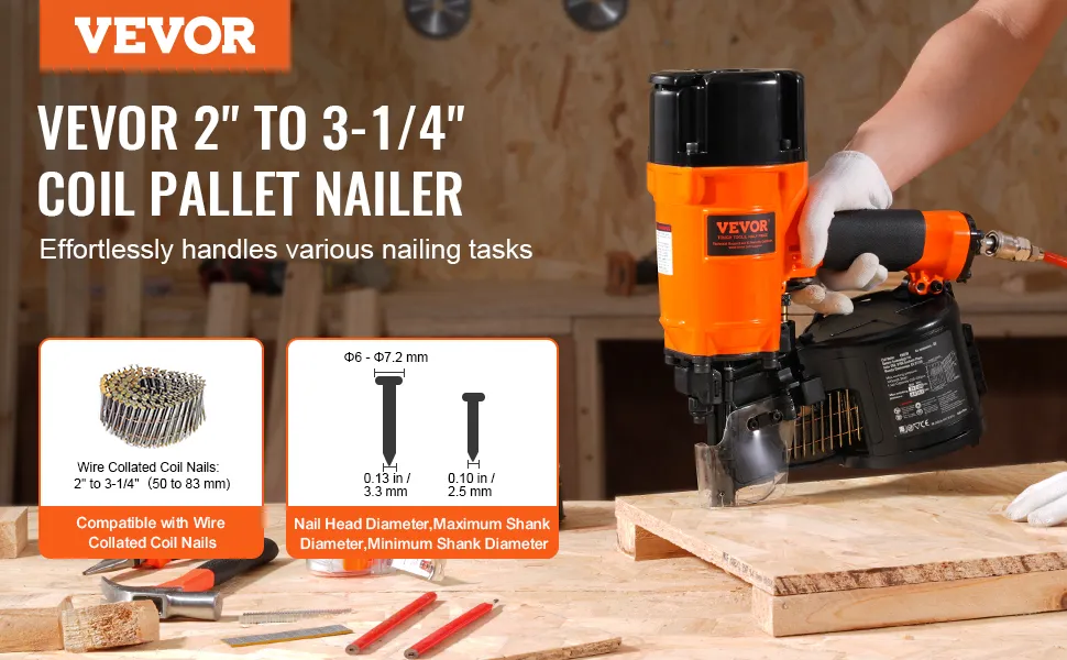 Exceptional Performance: VEVOR CN83N pneumatic coil nailer is designed for use with wire-collated coil nails, accommodating lengths from 50mm to 83mm and head diameters from Φ6 to Φ7.2 mm. It is ideal for assembling pallets, wooden boxes, fencing, and handling general construction tasks like siding, decking, and sheathing. (Compatible Shank Diameter: Min 2.5 mm - Max 3.3 mm )