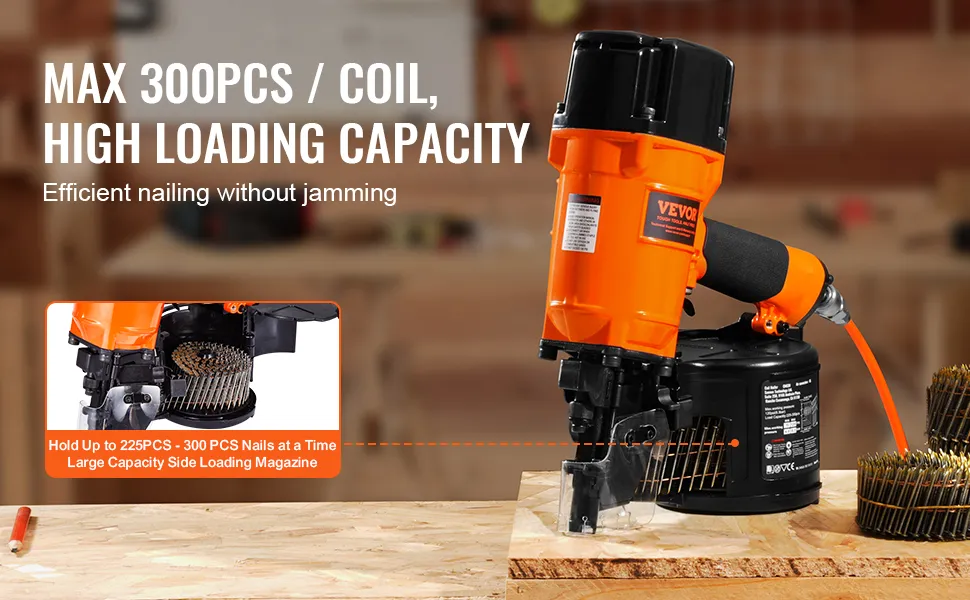 Equipped with a large-capacity side-loading magazine, this air coil nailer holds up to 225-300 nails at once. This high loading capacity allows for prolonged, efficient operation, minimizing the need for frequent reloading and keeping your work flow uninterrupted.