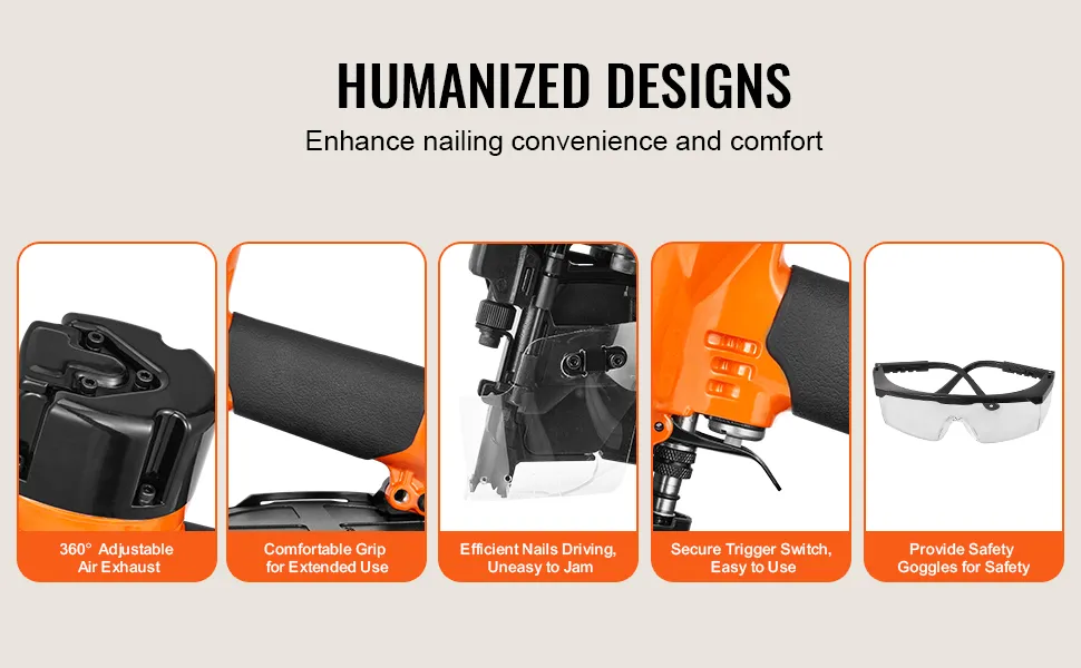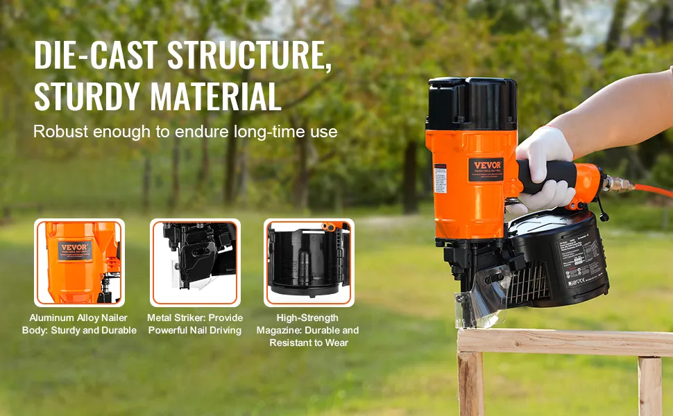 The coil nailer is compact and lightweight, featuring an ergonomic body and anti-slip handle grip that reduce hand fatigue. Its sturdy construction ensures long-term durability and reliable performance, making it ideal for demanding tasks.