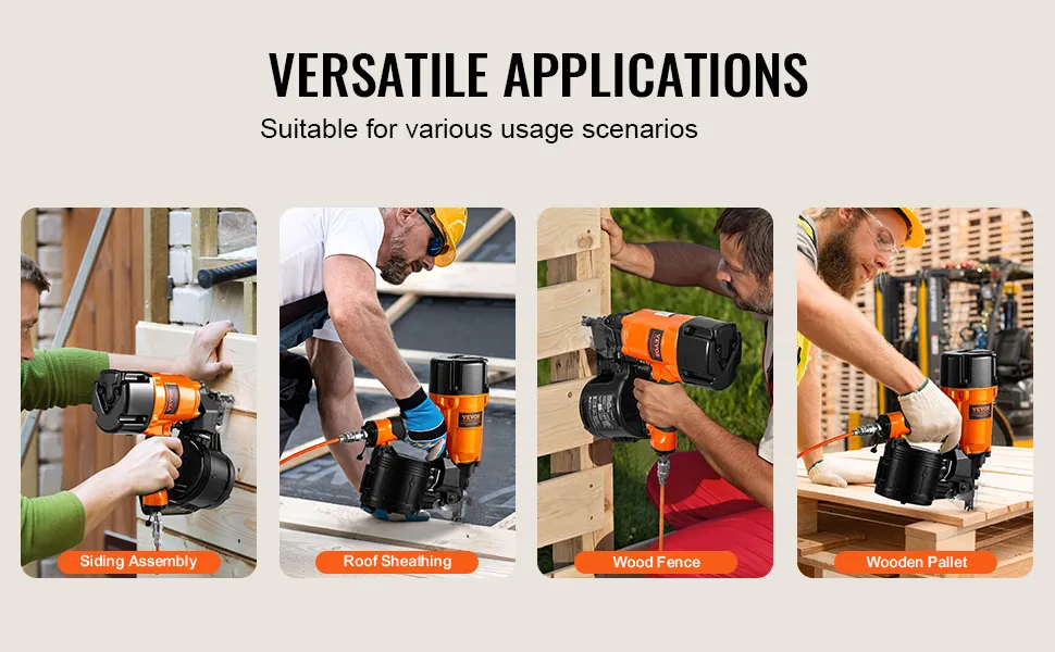 The VEVOR CN83N pneumatic coil nailer is compatible with wire-collated coil nails, accommodating lengths from 50mm to 83mm. It is perfectly suited for home improvement and repair tasks, excelling in a wide range of applications including siding, sheathing, woodworking, fencing, and decking.