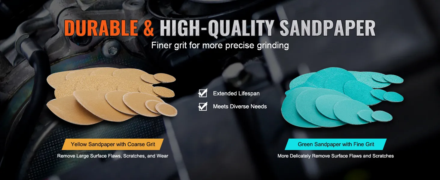 durable and high-quality VEVOR orbital air sander sandpaper in yellow coarse grit and green fine grit.