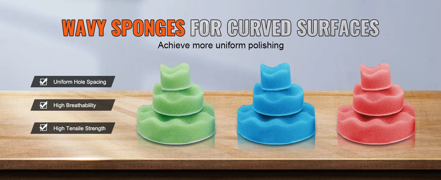 9 upgraded wavy foam pads (1/2/3 inches) are included to help you conquer curved surface sanding tasks with ease. These wavy foam pads offer superior adaptability to curved surfaces, including bends and irregular shapes, resulting in more efficient and precise polishing.