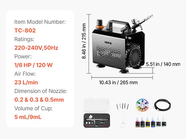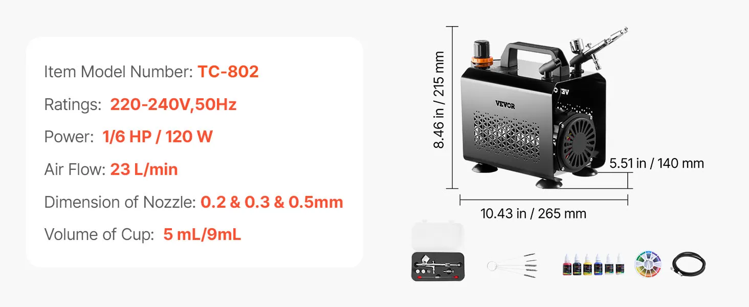 Our airbrush kit includes a compressor, a dual-action airbrush, 3 nozzles (0.2 mm, 0.3 mm, 0.5 mm), 4 acrylic paints, a thinner, a cleaner, a hose, a cleaning brush and a color wheel card. No extra purchases needed—ideal for beginners and pros alike.