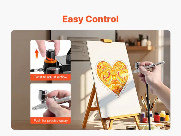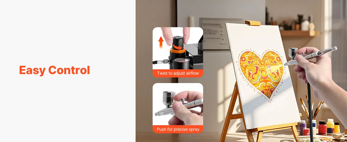 Easy Control, Beginner-Friendly Design: This airbrush kit with compressor includes a dual-action airbrush for independent air and paint control. The adjustable pressure knob ensures smooth, consistent spray, easy even for beginners