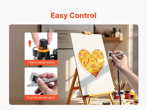 Easy Control, Beginner-Friendly Design: This airbrush kit with compressor includes a dual-action airbrush for independent air and paint control. The adjustable pressure knob ensures smooth, consistent spray, easy even for beginners