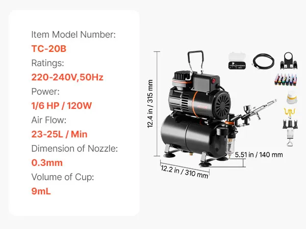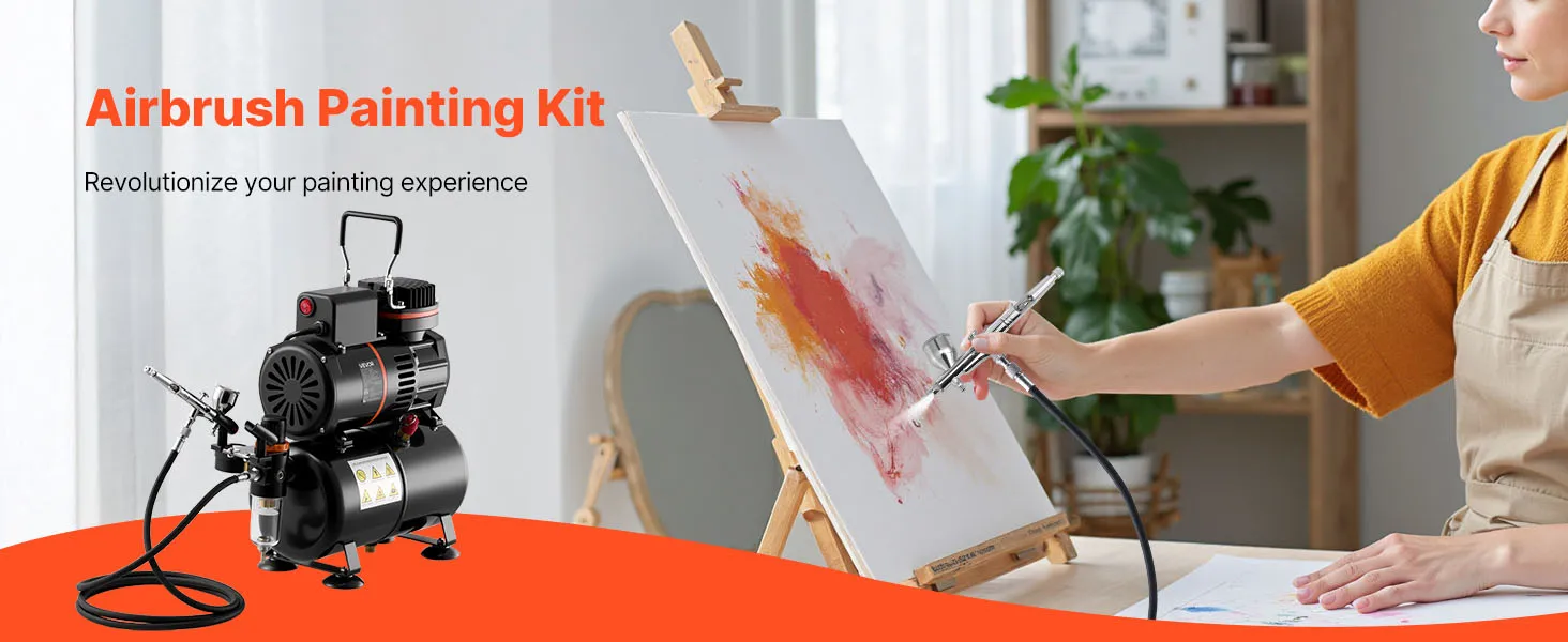 VEVOR Airbrush Kit, 1/6 HP, Air Brush Kit with Air Compressor and Tank, 1 Dual-Action Professional Airbrush with 1 Tip, Hose, Acrylic Paint, 2 Fans, for Cake Decorating, Model Painting, Nail Art
