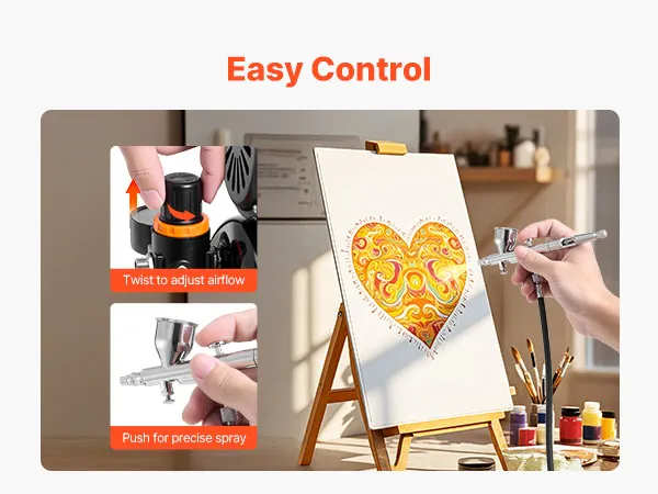 Easy Control, Beginner-Friendly Design: This airbrush kit with compressor includes a dual-action airbrush for independent air and paint control. The adjustable pressure knob ensures smooth, consistent spray, easy even for beginners