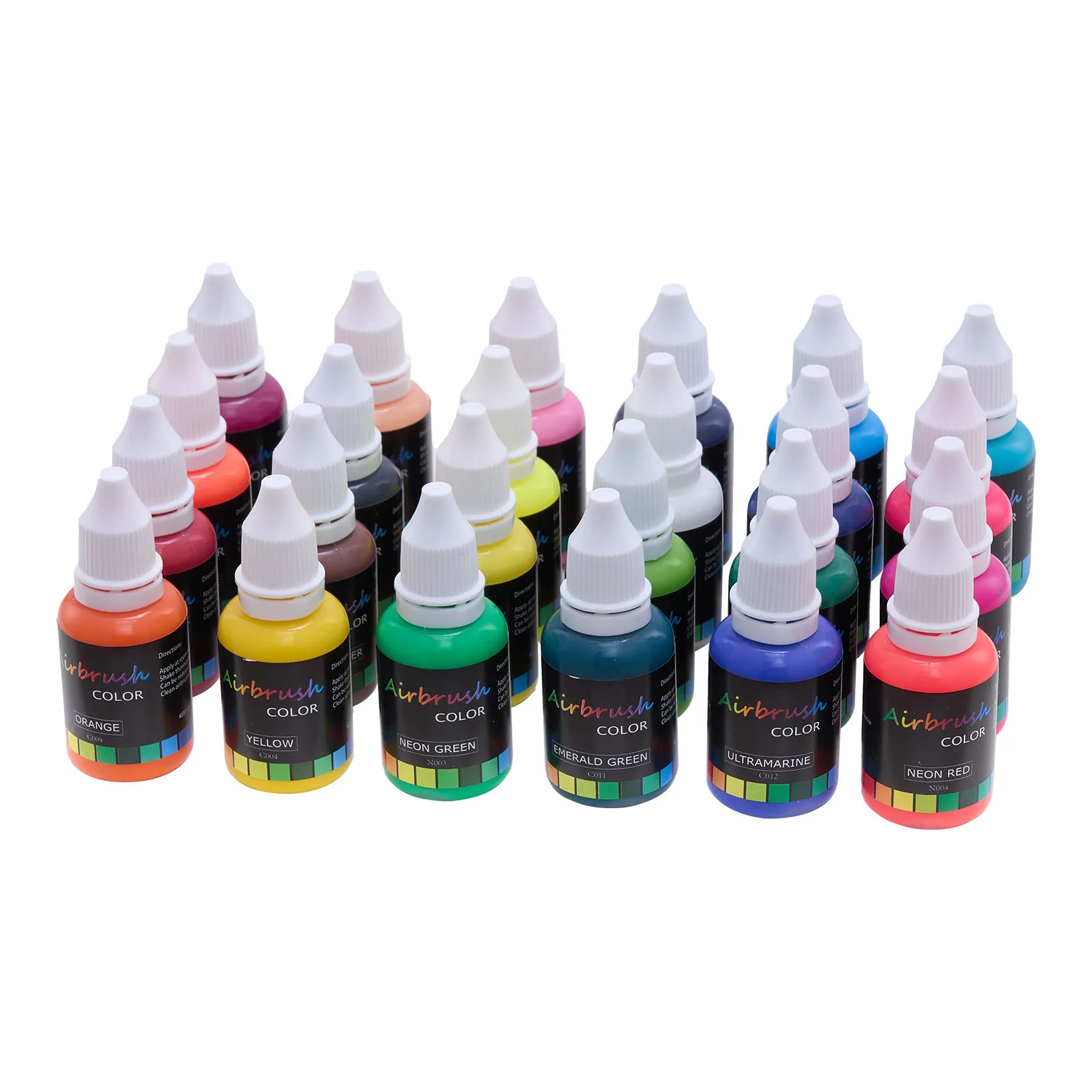 The airbrush kit with compressor includes 24 essential paints with rich tones, ideal for mixing colors and experimenting with various styles.