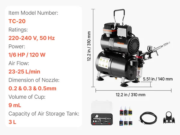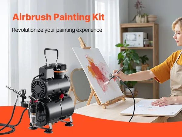 VEVOR Airbrush Kit, 1/6 HP, Air Brush Kit with Air Compressor and Tank, 1 Dual-Action Professional Airbrush with 3 Tips, Acrylic Paint, Low Noise, for Cake Decorating, Model Painting, Nail Art
