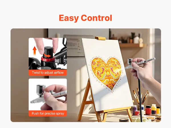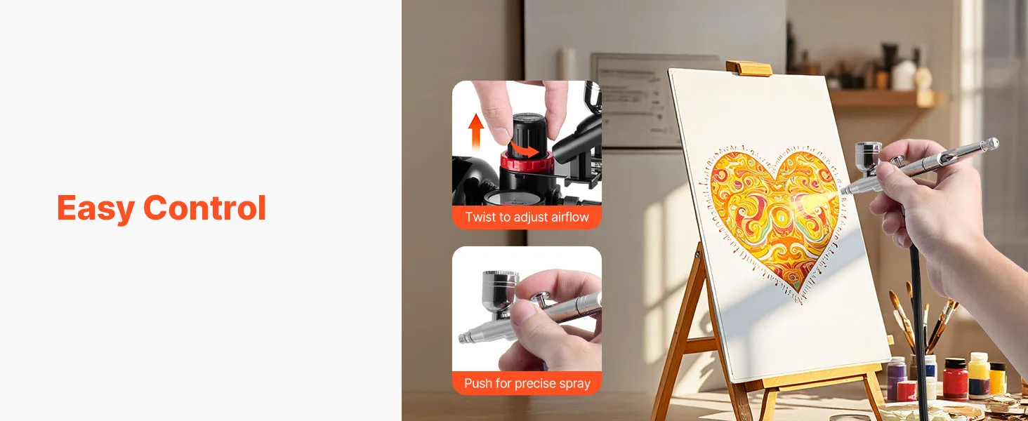 Easy Control, Beginner-Friendly Design: This airbrush kit with compressor includes a dual-action airbrush for independent air and paint control. The adjustable pressure knob ensures smooth, consistent spray, easy even for beginners
