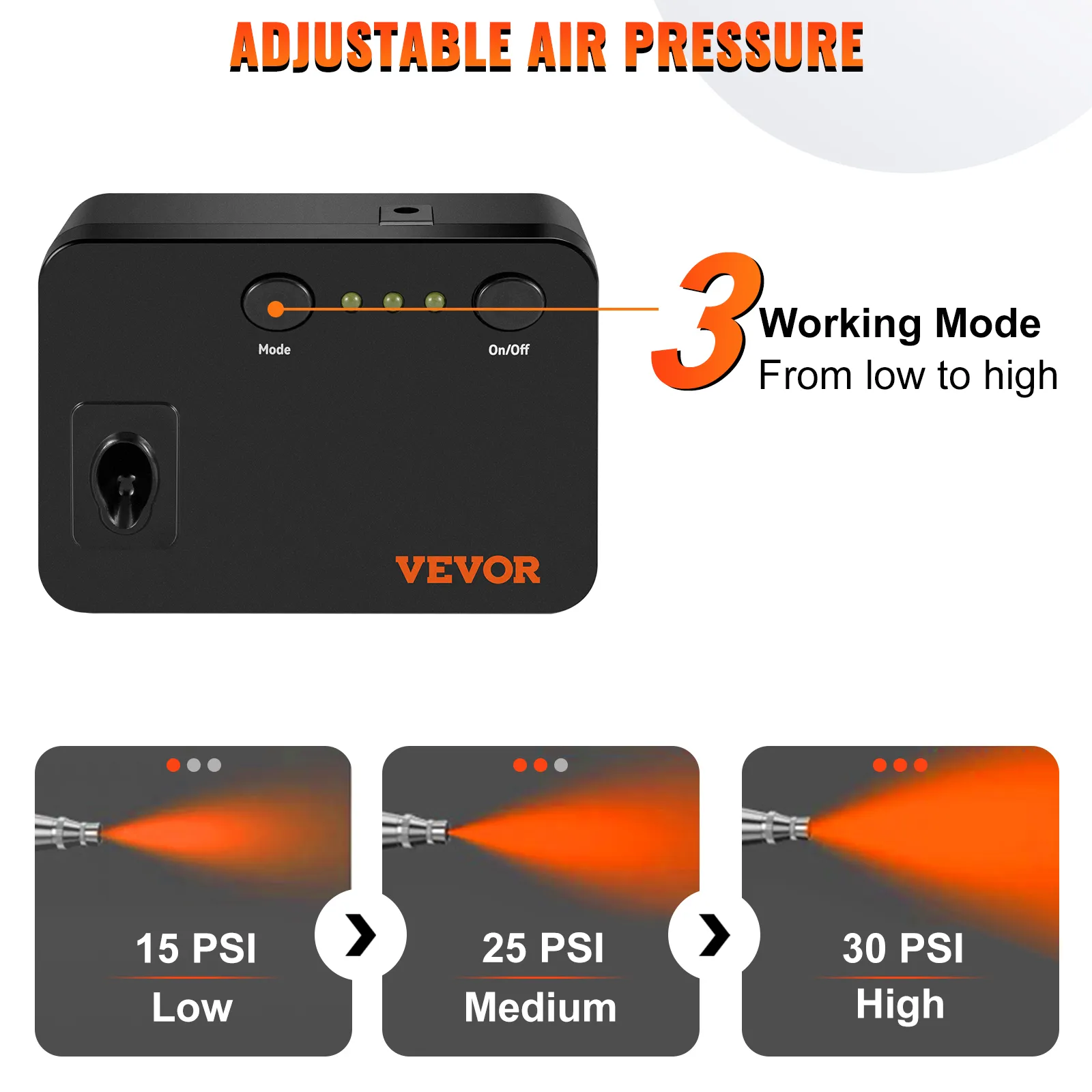 0-32PSI 3 adjustable pressure modes. High air pressure mode is dedicated to fast spraying, while the low mode is for more detailed spraying.