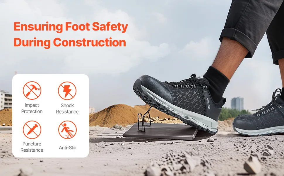 Lighter Weight: Compared to steel-toe shoes, our men steel toe sneakers use aluminum alloy for the toe cap, making them 26% lighter. The breathable mesh upper prevents discomfort from sweaty feet, while the soft rubber sole provides additional comfort. These shoes are perfect for construction workers who need to stand or walk for long hours on job sites.
