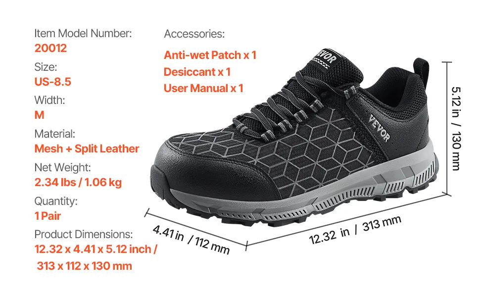 VEVOR Steel Toe Shoes for Men, US Size 8.5, Men’s Cushion Sport Safety Toe Athletic Work Shoe, Indestructible Safety Sneakers Lightweight,Breathable Industry Construction Work Shoes, Black
