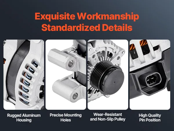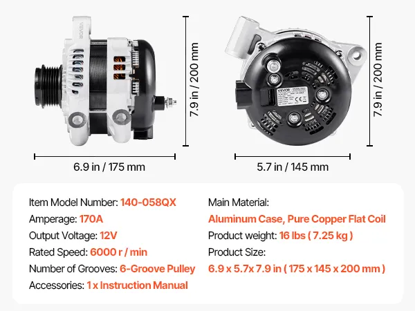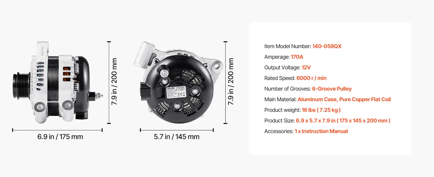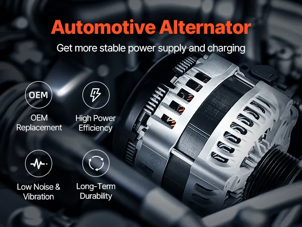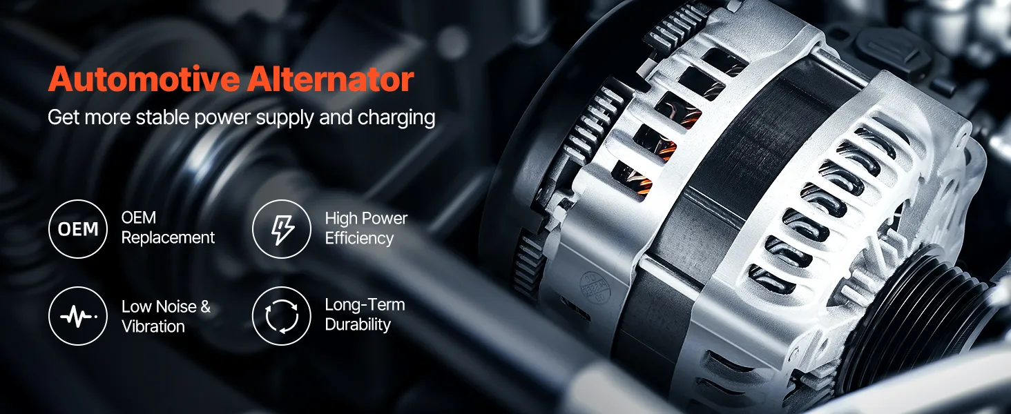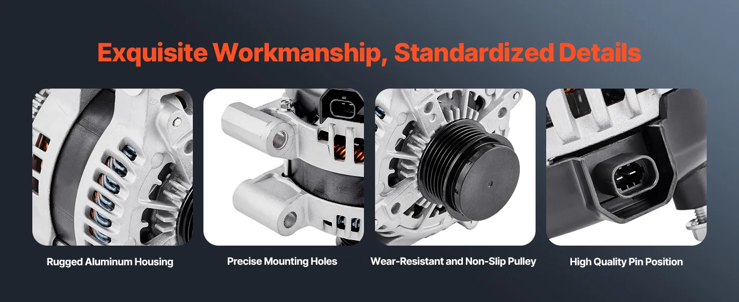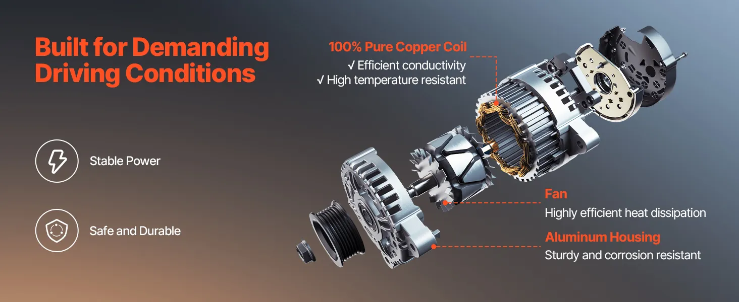 Our alternator replacement features pure copper coils for better durability than aluminum. The aluminum housing and cooling fan boost heat dissipation. It delivers a stable 130A output to support high-load devices like AC and premium sound systems.