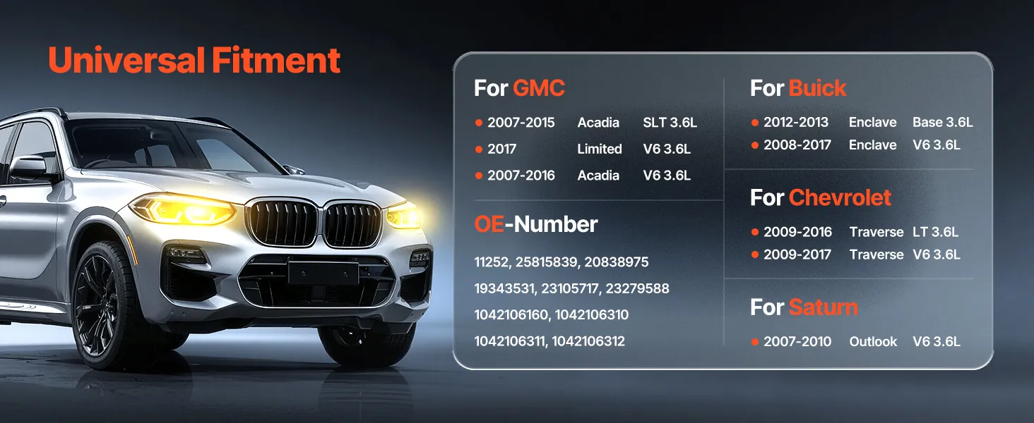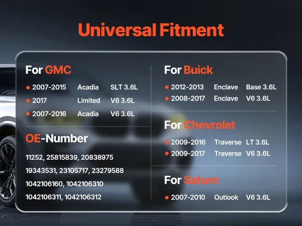 Vehicle Compatibility: Our alternator works great on SUVs. It fits Buick 2012-2013 Enclave Base 3.6L, Chevrolet 2009-2016 Traverse LT 3.6L, GMC 2007-2015 Acadia SLT 3.6L, and Saturn 2007-2010 Outlook V6 3.6L. See images for more fitment details