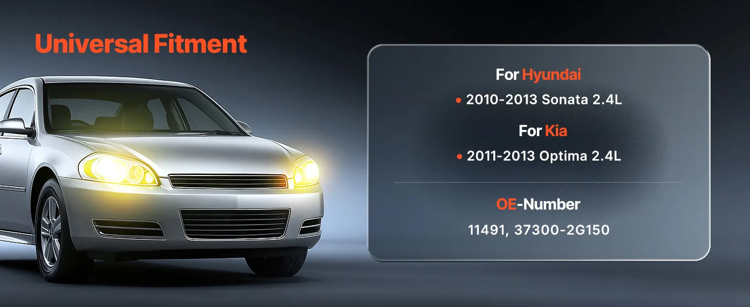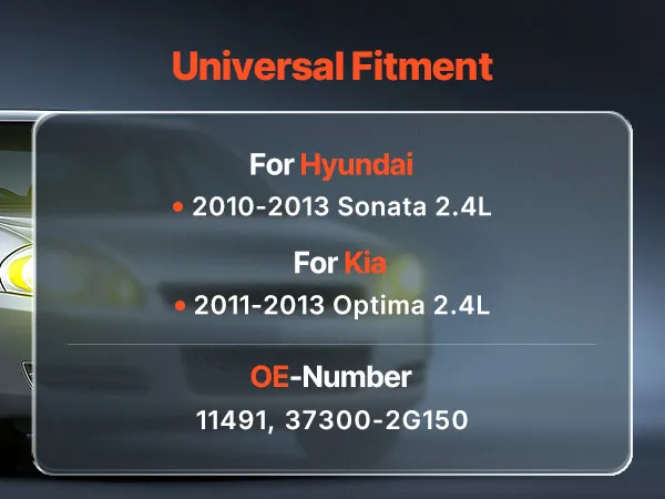 Vehicle Compatibility: Our alternator works great on mid-size sedans. It fits Hyundai 2010-2013 Sonata 2.4L, and Kia 2011-2013 Optima 2.4L