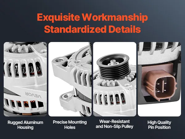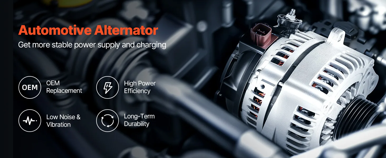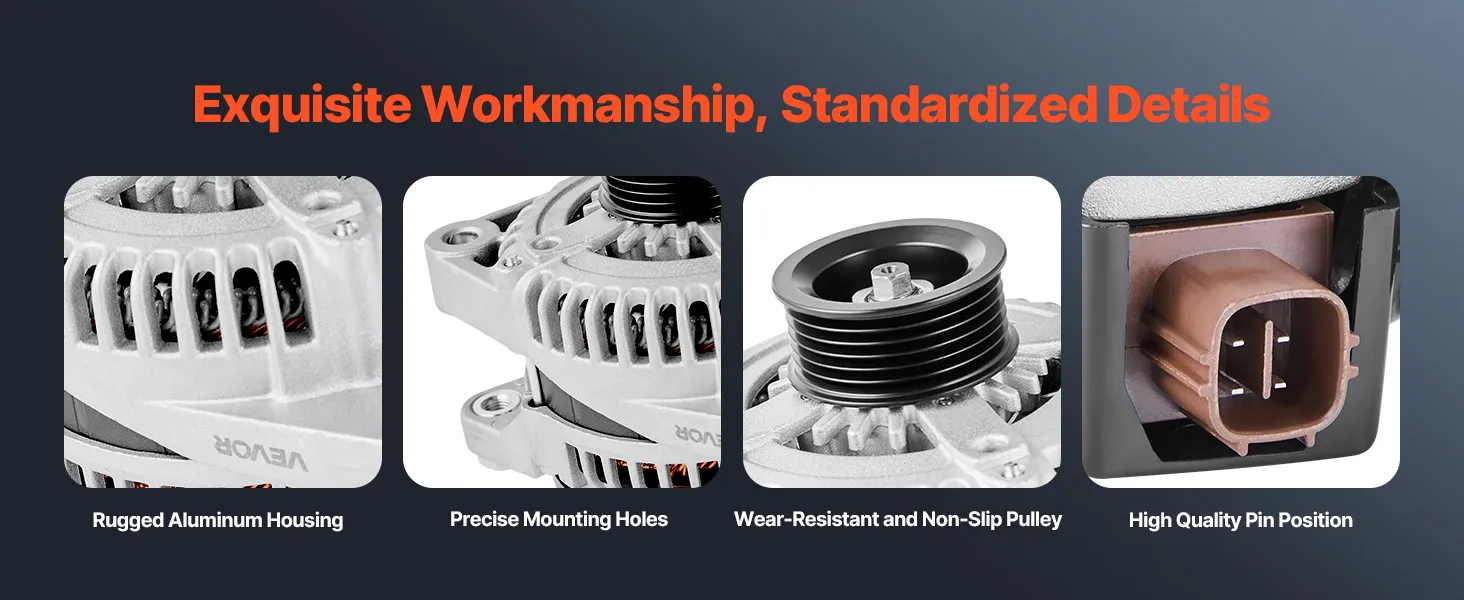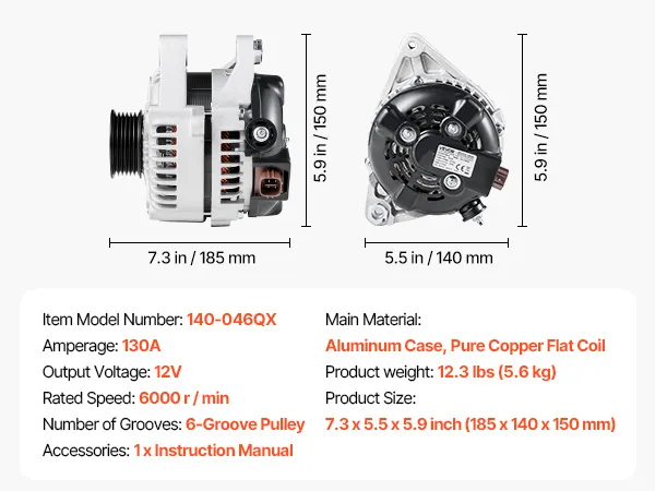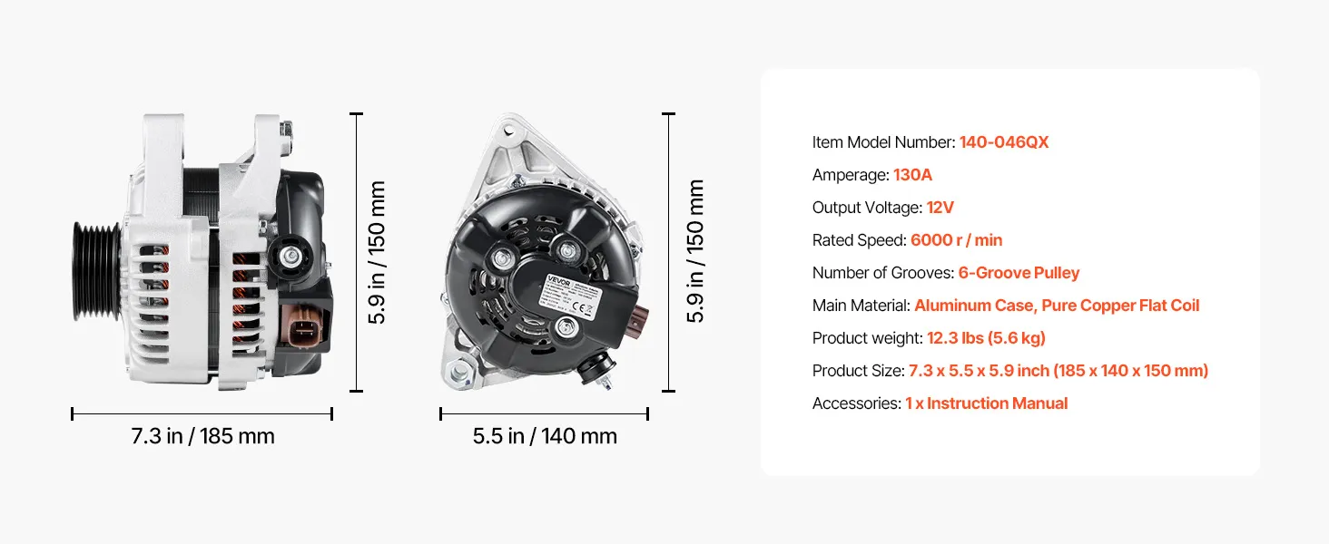 Our alternator replacement features pure copper coils for better durability than aluminum. The aluminum housing and cooling fan boost heat dissipation. It delivers a stable 130A output to support high-load devices like AC and premium sound systems.