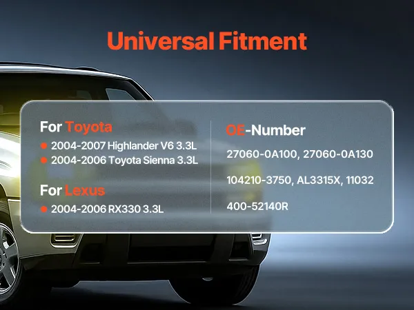 Vehicle Compatibility: Our alternator works great on SUVs and MPVs. It fits Toyota 2004-2007 Highlander V6 3.3L, 2004-2006 Toyota Sienna 3.3L, and Lexus 2004-2006 RX330 3.3L