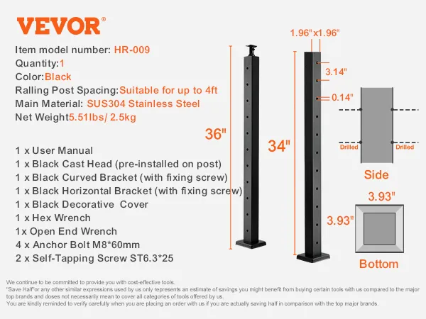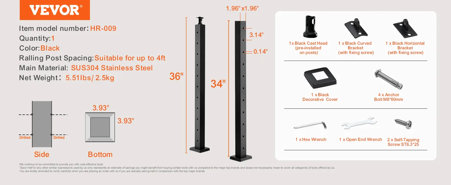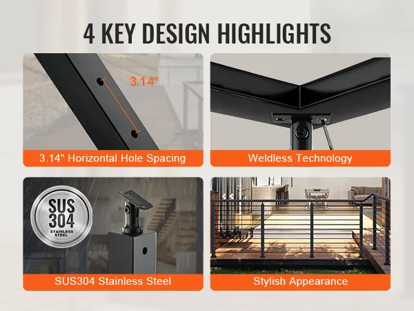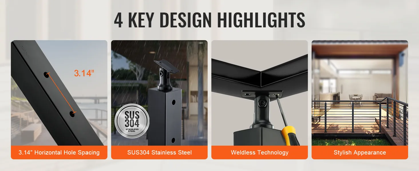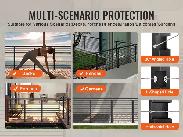 The VEVOR cable railing post provides a reliable safety solution for your deck or railing. This stainless steel cable rail post is made from high-quality SUS304 steel, that ensures long-lasting durability. With a height of 66 inches, this post offers plenty of protection. The 0.41-inch holes, totalling 10, ensure safety and compliance with standards. This railing post is ideal for indoor and outdoor settings, providing peace of mind. It is perfect for decks, porches, patios and more. The black colour adds a modern touch to any space. The strong design ensures that it can withstand various weather conditions.