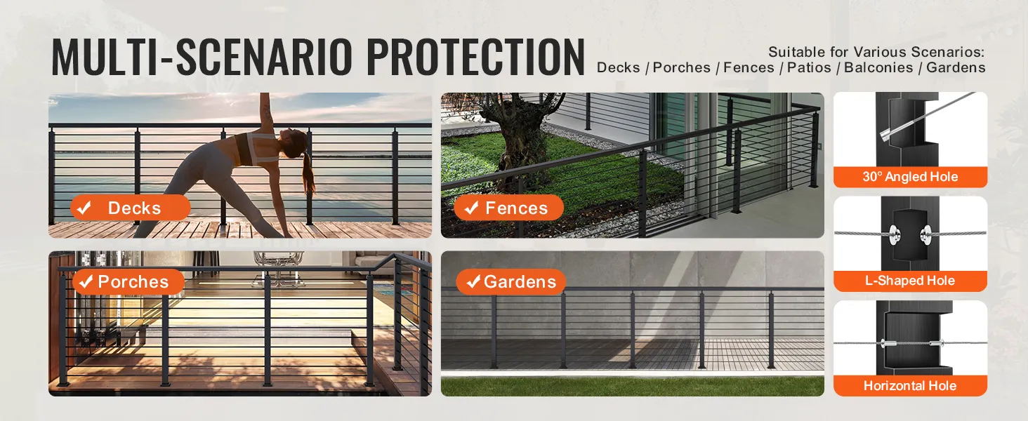 This cable railing post is versatile and suitable for various settings. It can be used indoors for staircases, balconies, and patios. Outdoors, it is perfect for decks, porches and gardens. This versatility makes it a practical choice for different projects. You can use it in residential buildings, commercial offices, and hotels. The product ensures safety and protection wherever it is installed. It's designed to meet the needs of different environments. No matter if you need it for home or commercial use, this product has you covered.