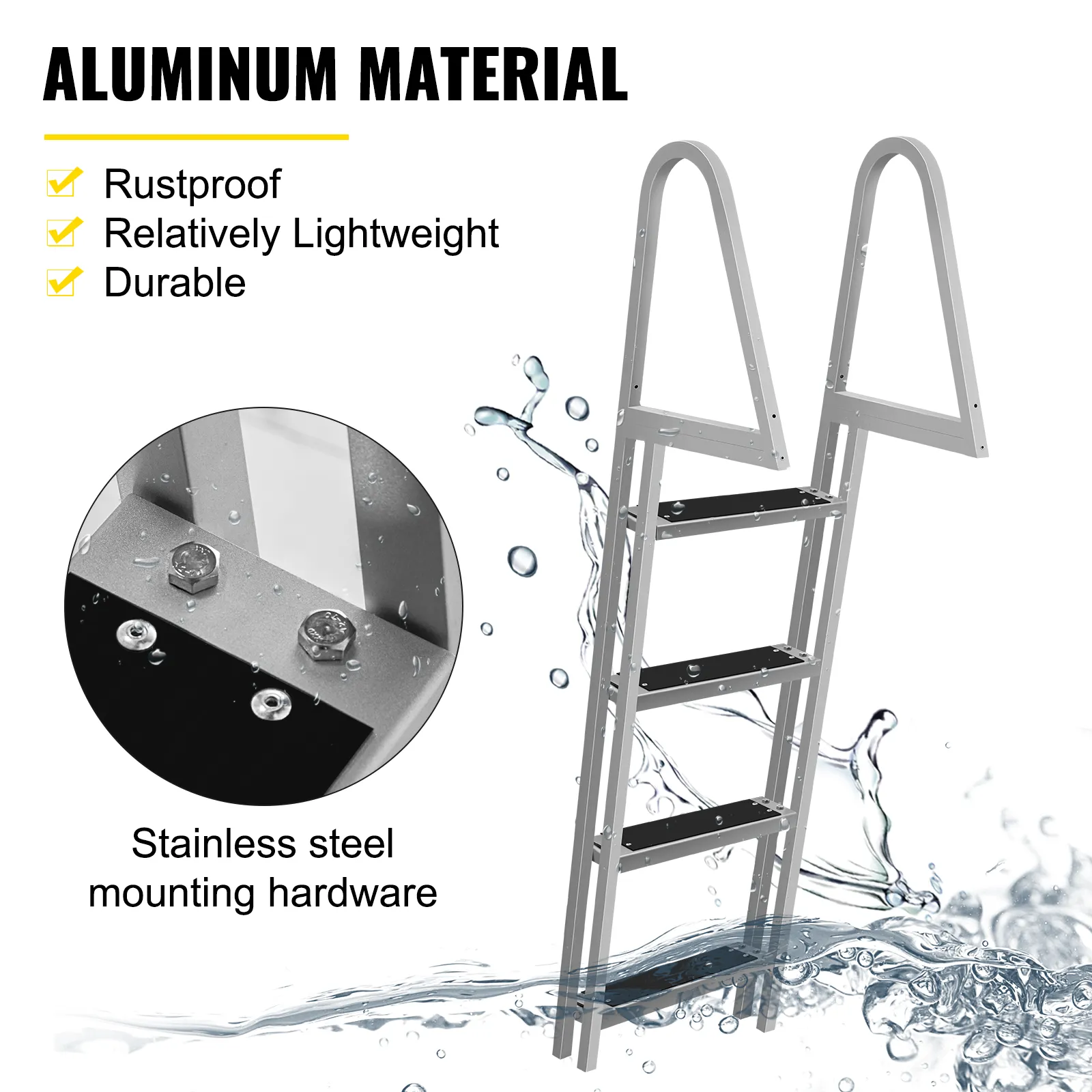 Made of aluminum material, relatively lightweight, and rust-resistant, the boat dock ladder with stainless steel mounting kit ensures durability and longevity.