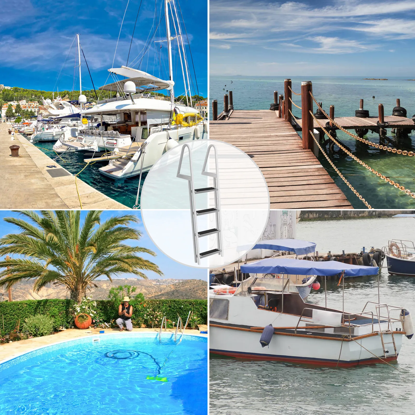 The aluminum ladders are suitable for your ship, dock, or swimming pool to make it easier for people to get on and off.