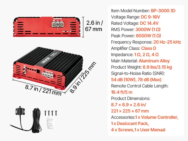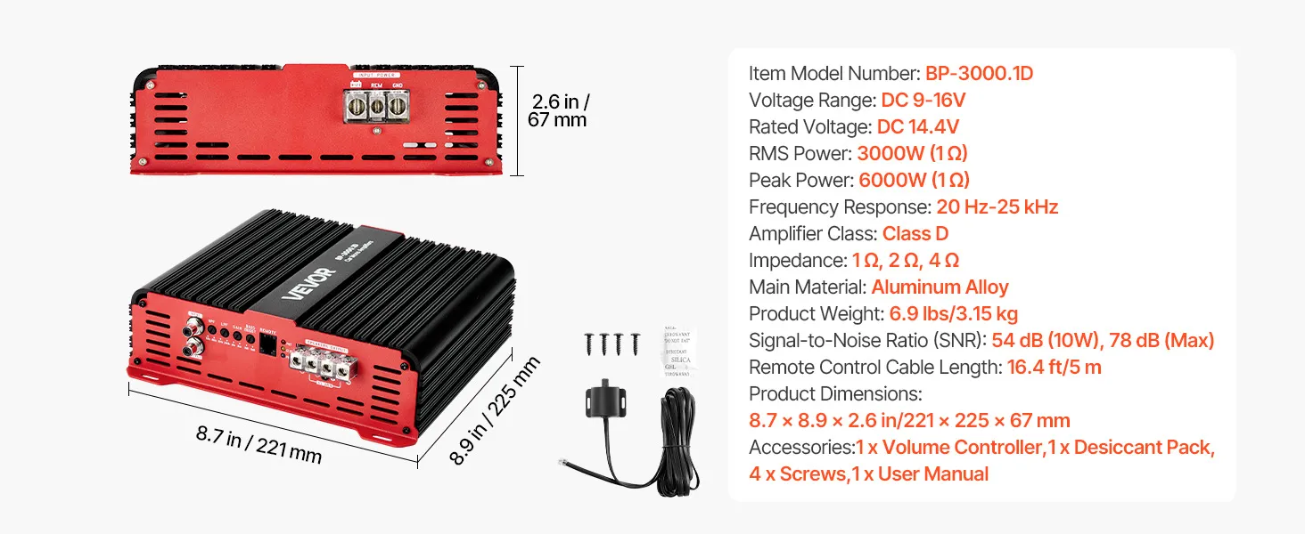 VEVOR Monoblock Car Amplifier, 3000W RMS MAX, 1/2/4 Ohm Stable, 1-Channel Class D Car Audio Amplifier with Remote Subwoofer Level Control, Low Pass Filter and Bass Boost, Volume Controller Included