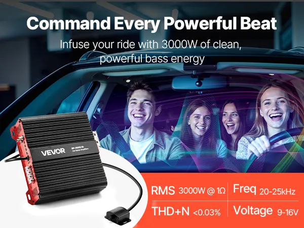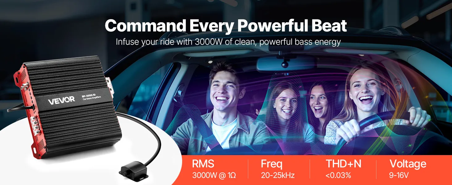3000W RMS Power: Ultimate Bass. The Class D monoblock car amplifier delivers 3000W RMS at 1Ω, designed for competition-level sound pressure and extreme impact. It provides a tsunami of bass while maintaining ultra-low distortion at maximum volume