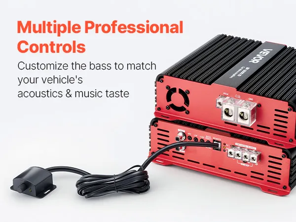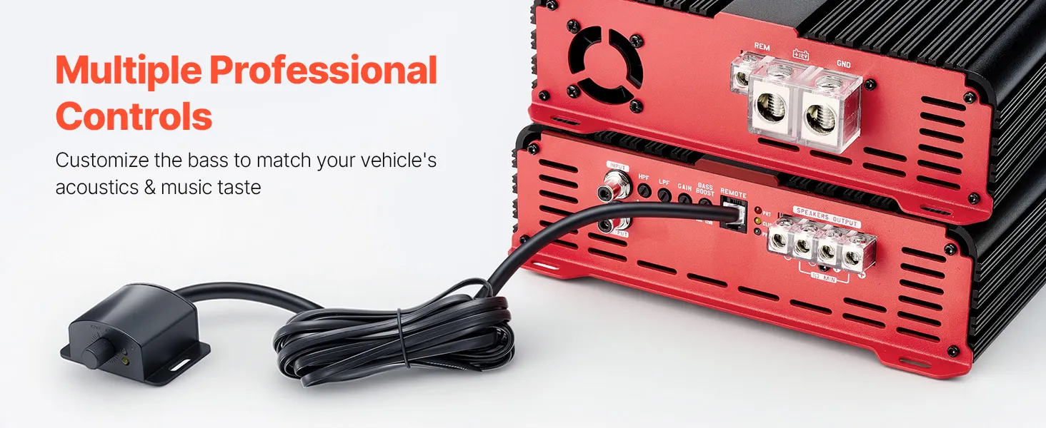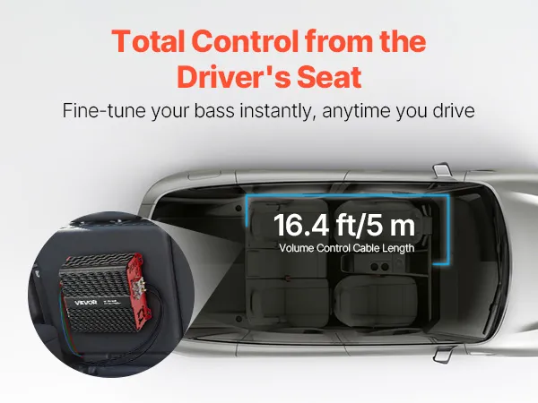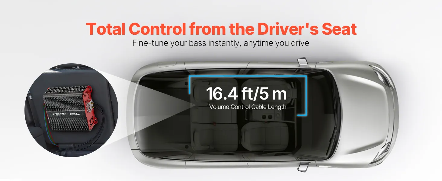 Real-Time Volume Control: The monoblock amplifier's controller has a 16.4 ft cable, allowing you to adjust the bass volume strength from the driver's seat. The panel includes low pass filter, bass boost, and input sensitivity for pre-drive customization