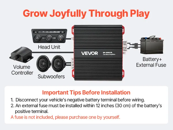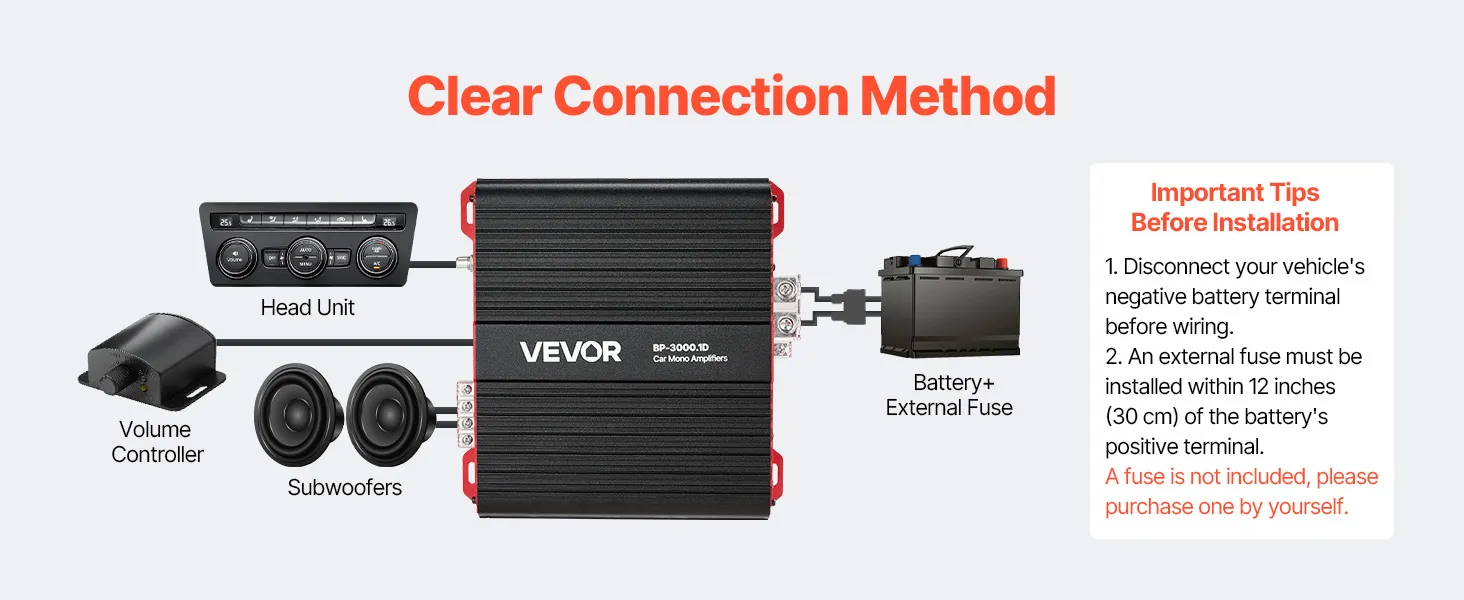 Before use, an additional fuse is required to avoid damage to your wiring in case of a short circuit. Install in a dry, well-ventilated spot in the trunk or cabin, ensuring sufficient space around the car mono amplifier for heat dissipation.