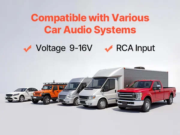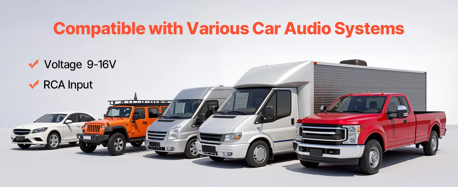 Our car amplifier is highly compatible with sedans, SUVs, trucks, and RVs. With wide voltage input and adjustable level input, it connects seamlessly to your audio system, whether it's a high-end head unit with RCA outputs or a simplified version.