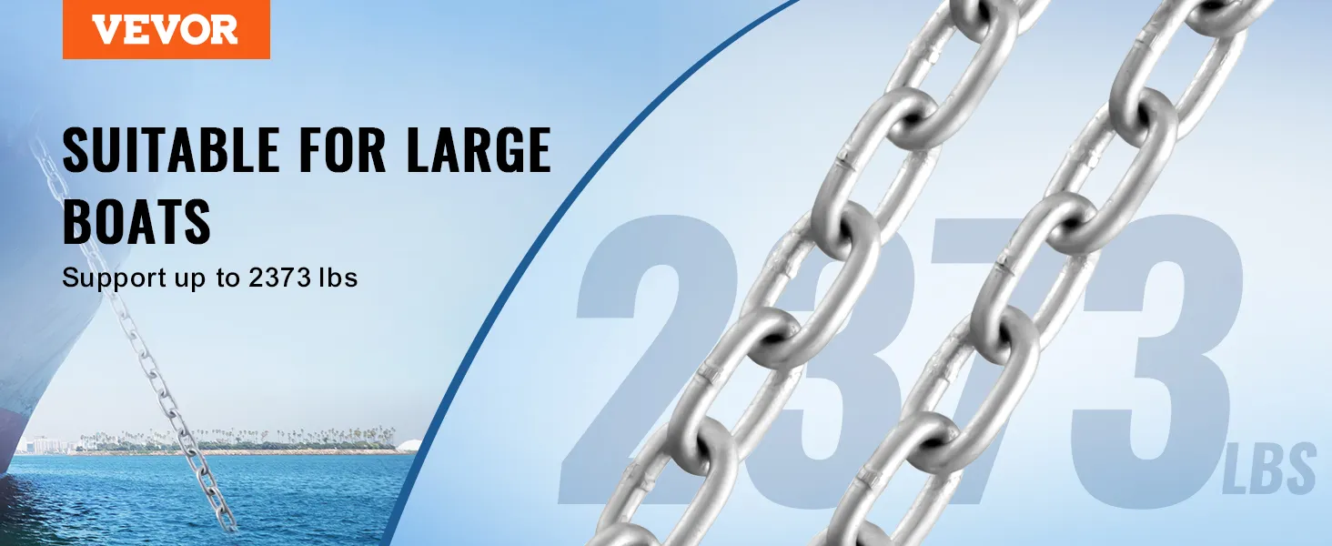 This is why the VEVOR boat anchor chain is corrosion-resistant. It ensures that the chain lasts a long time. Made of durable galvanized steel, this material resists rust and corrosion. Safety at sea is essential. Strong, corrosion-resistant chain matters. The chain holds up well in marine environments. You keep your boat secure. That's where you get peace of mind while boating. It conserves your time and energy. Resistance to rust means less maintenance. As a result, the chains remain dependable for an extended period. And so, it provides long-term safety and security.