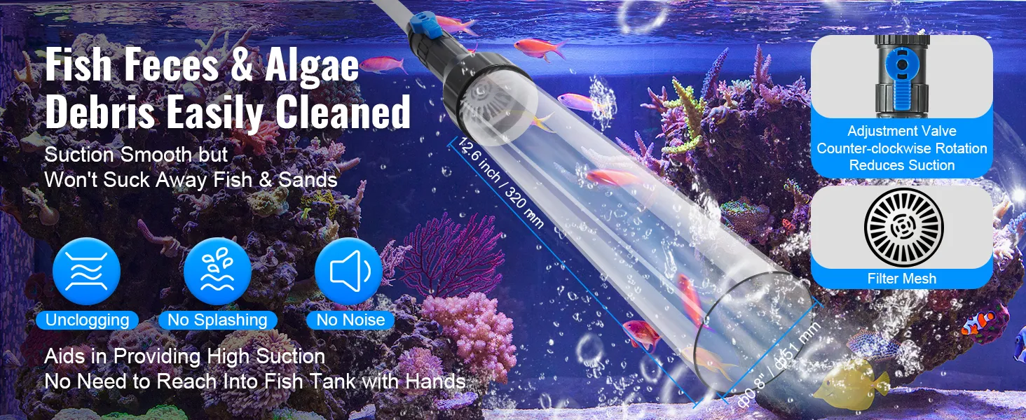Quietly Clean Fish Waste and Gravel: When draining, extend the 12.6 inch gravel pipe into the aquarium. The long pipe allows you to clean the bottom without touching dirty water, making cleaning easy even in tall aquariums. With an internal filter net, fine pores prevent sand from entering; the large diameter of φ0.8" / φ51 mm helps improve the efficiency of sucking up fish waste and other viscous substances. The entire process is noiseless, ensuring the fish are not disturbed.