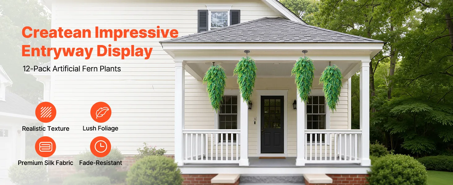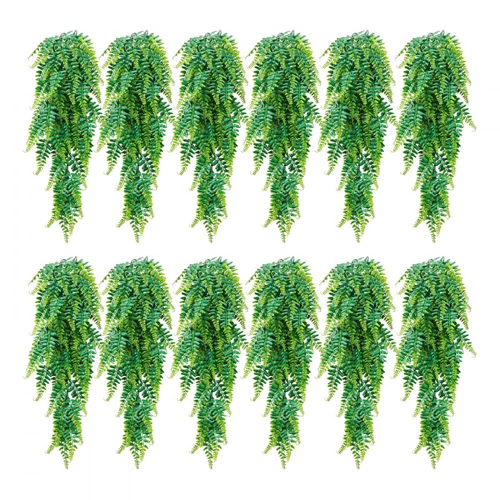 VEVOR Artificial Ferns, 12 Pcs Fake Hanging Boston Fern Bush Plant with 813 mm Hanging Length, Plastic Faux Greenery for Indoor/Outdoor Decor, For Wall, Wedding Party, Home, Porch Garden, No Basket