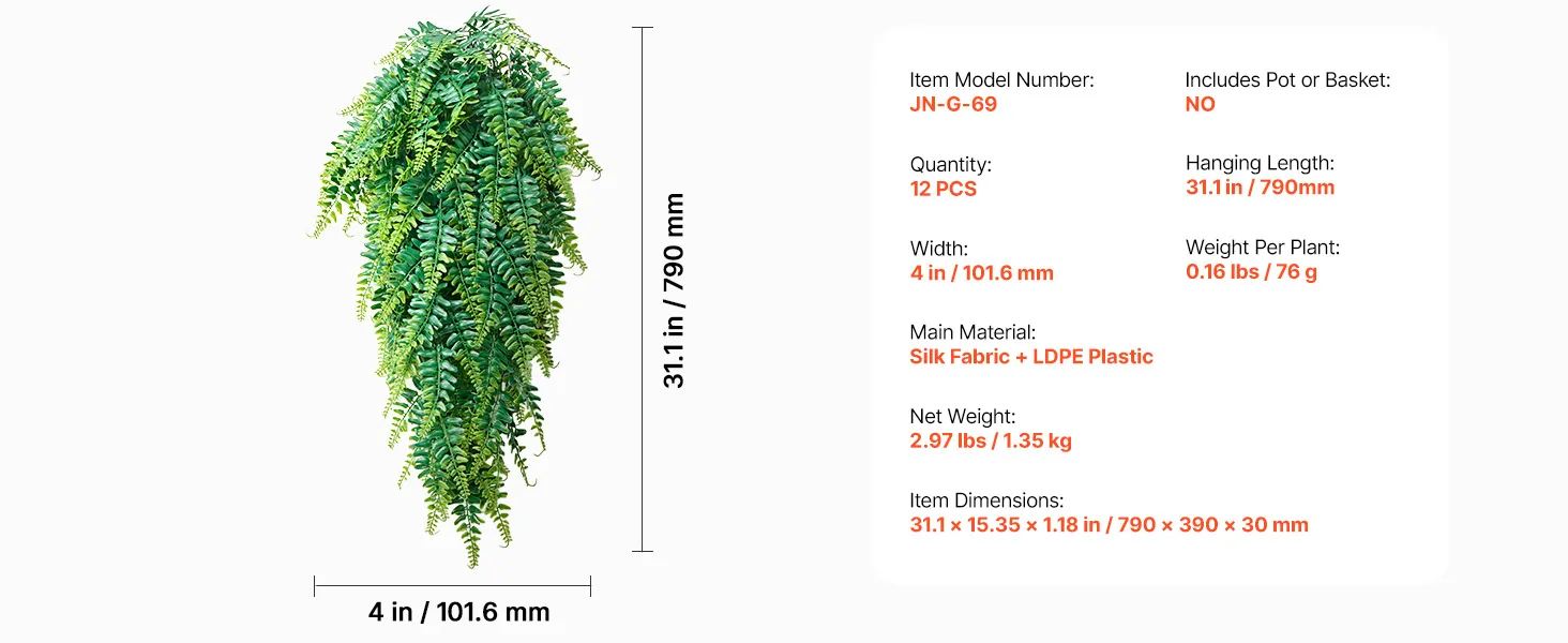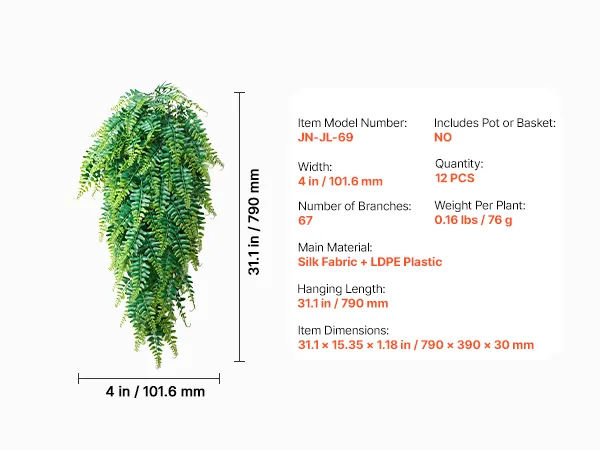 Twelve Artificial Ferns: Each set includes twelve of our artificial ferns. Gently shape fronds and branches by hand or use a low?heat blower to restore form after delivery. Each fern measures about 4 in/101.6 mm wide with a 32 in/812.8 mm hanging length