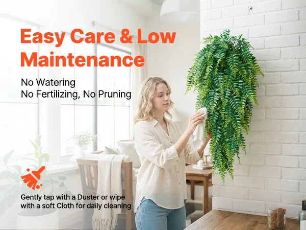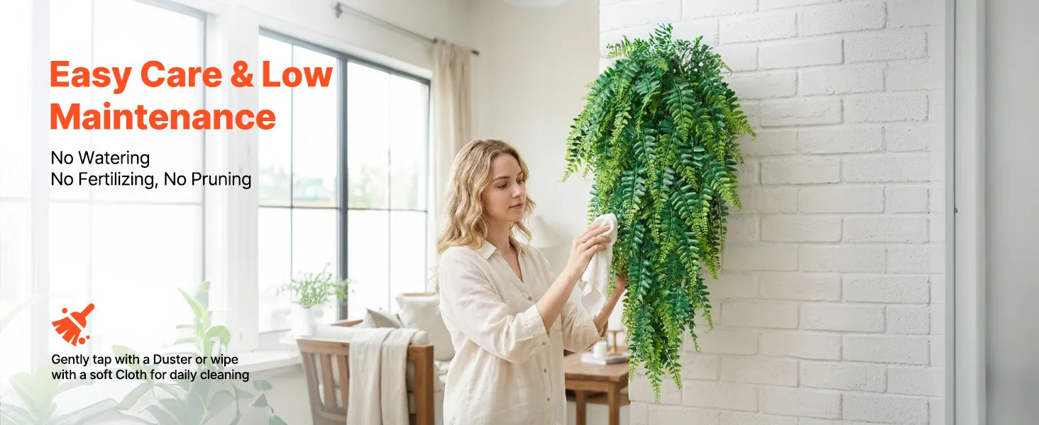 Low Maintenance: Our fake fern stays green year-round and requires no watering, soil, or trimming. Simply wipe it occasionally to refresh. If it gets wet, dry them with a hair dryer to help maintain its vibrant appearance