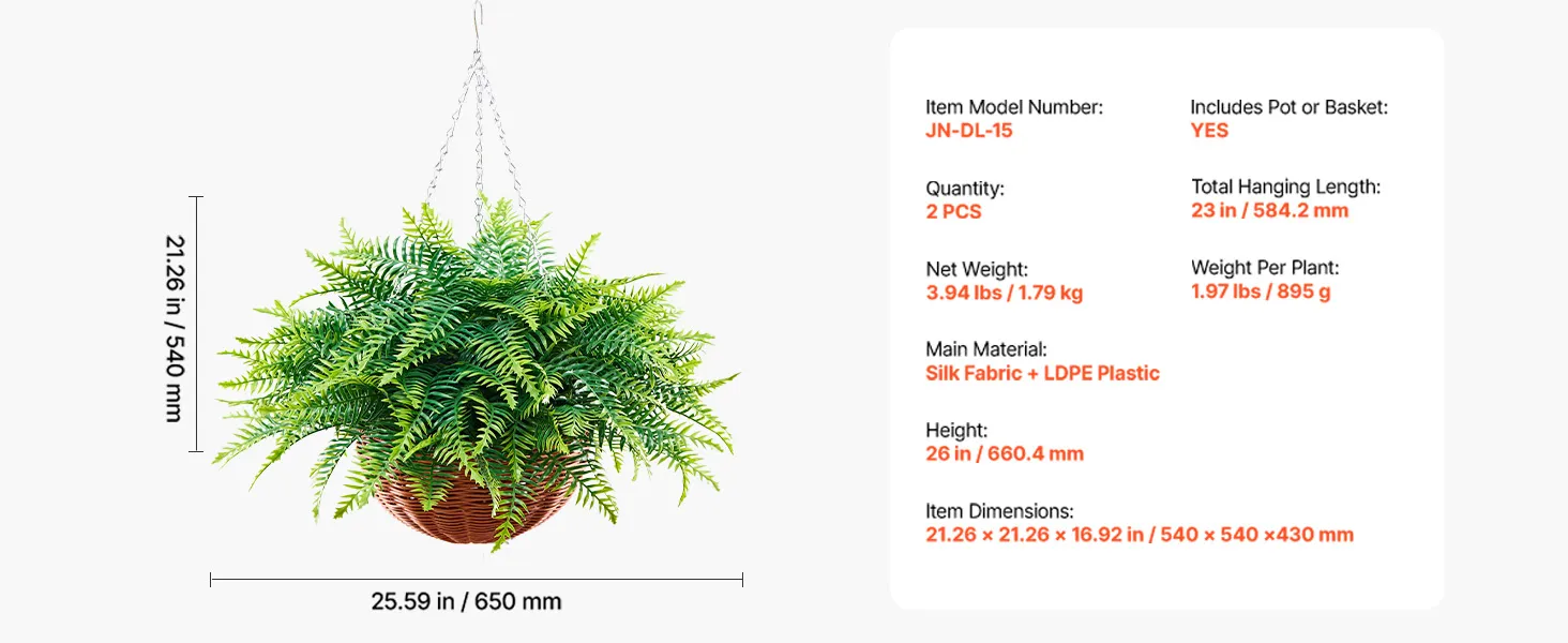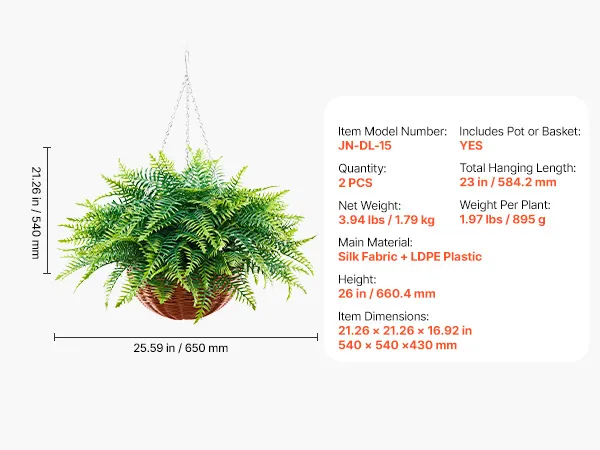 Two Artificial Ferns: Each set includes two of our artificial ferns. Gently shape fronds and branches by hand or use a low?heat blower to restore form after delivery. Each fern measures about 26 in/660.4 mm height with a 23 in/584.2 mm hanging length