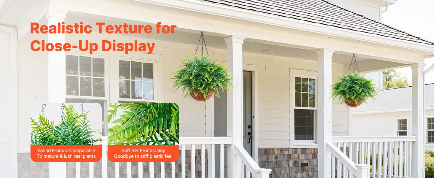 Naturally Realistic: These fake ferns feature silk fronds that mimic the soft touch and fine texture of real plants while helping resist fading. Weather-proof LDPE branches and reinforced carbon steel wire roots help maintain shape in wind and rain