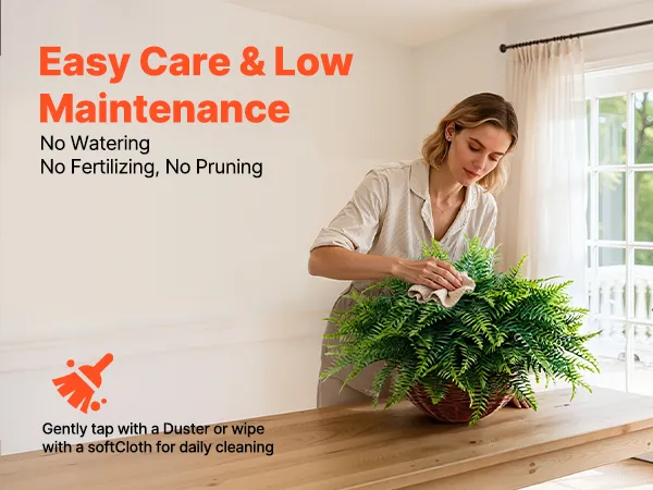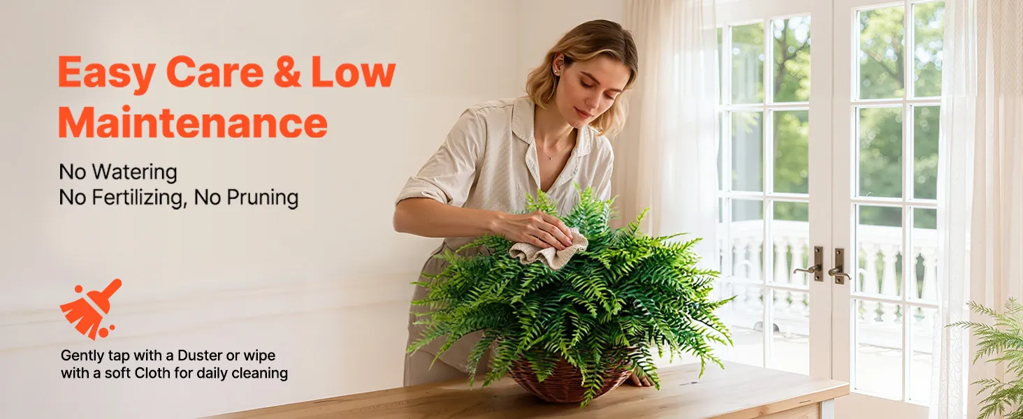 Low Maintenance: Our fake fern stays green year-round and requires no watering, soil, or trimming. Simply wipe it occasionally to refresh. If it gets wet, dry it with a hair dryer to help maintain its vibrant appearance