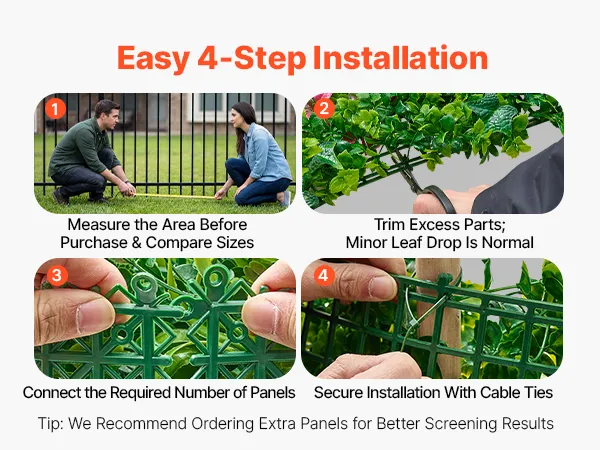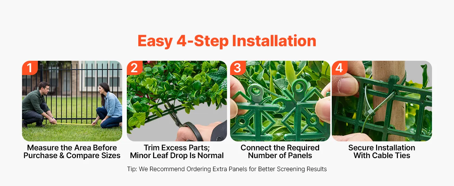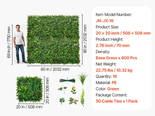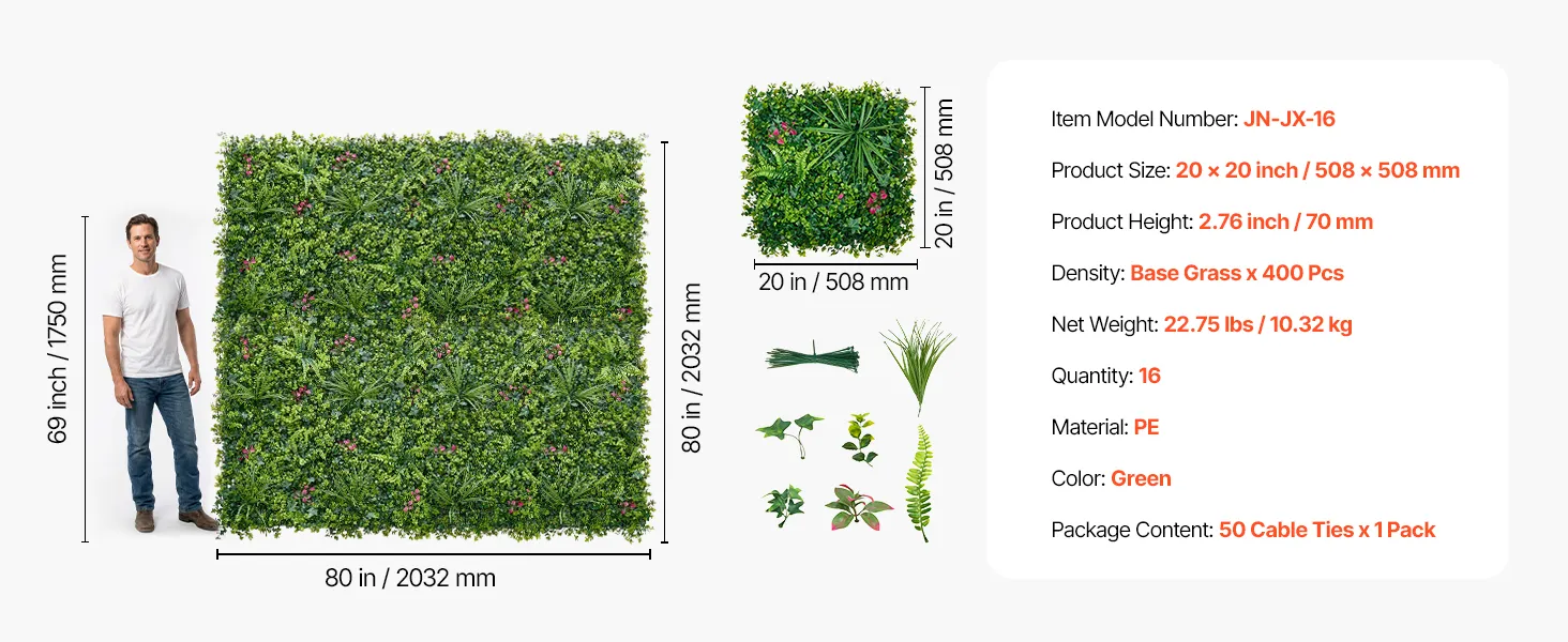 16 Panels for Flexible Coverage: Each artificial boxwood panel measures 20 x 20 in. When combined, the set covers up to 44.4 sq ft as a grass wall backdrop. Zip ties are included for easy securing, and panels can be trimmed with scissors to fit your space
