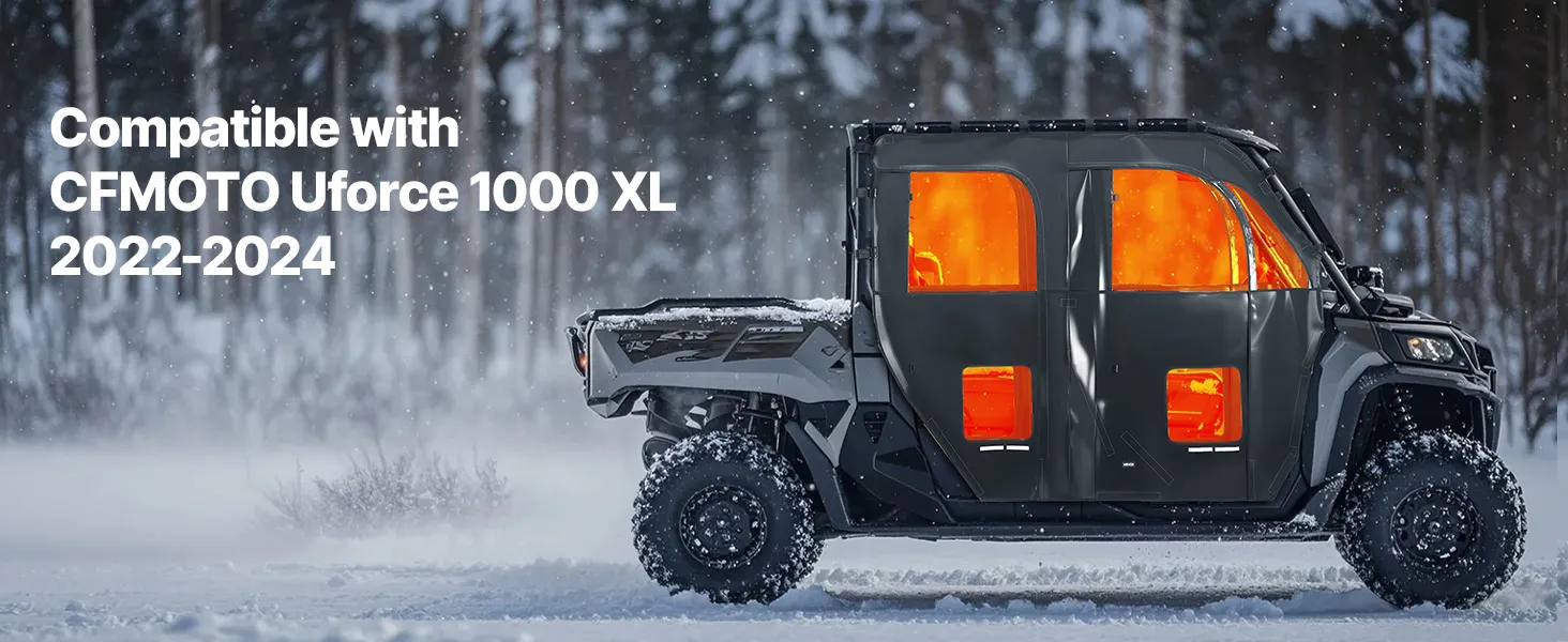 Our cab enclosure upper doors are compatible with CFMOTO Uforce 1000 XL 2022-2024. They enhance off-road driving comfort for trail adventures, farm work, muddy terrain, and winter rides.